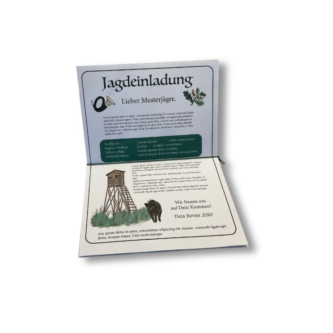 Es gibt so viele Anlässe, zu der diese tolle Einladungskarte passt. Sei es zum offiziellen Jägerschlag, zur Geburtstagsfeier, natürlich zur Drückjagd, oder einfach ein geselliger Abend unter Jagdfreunden.