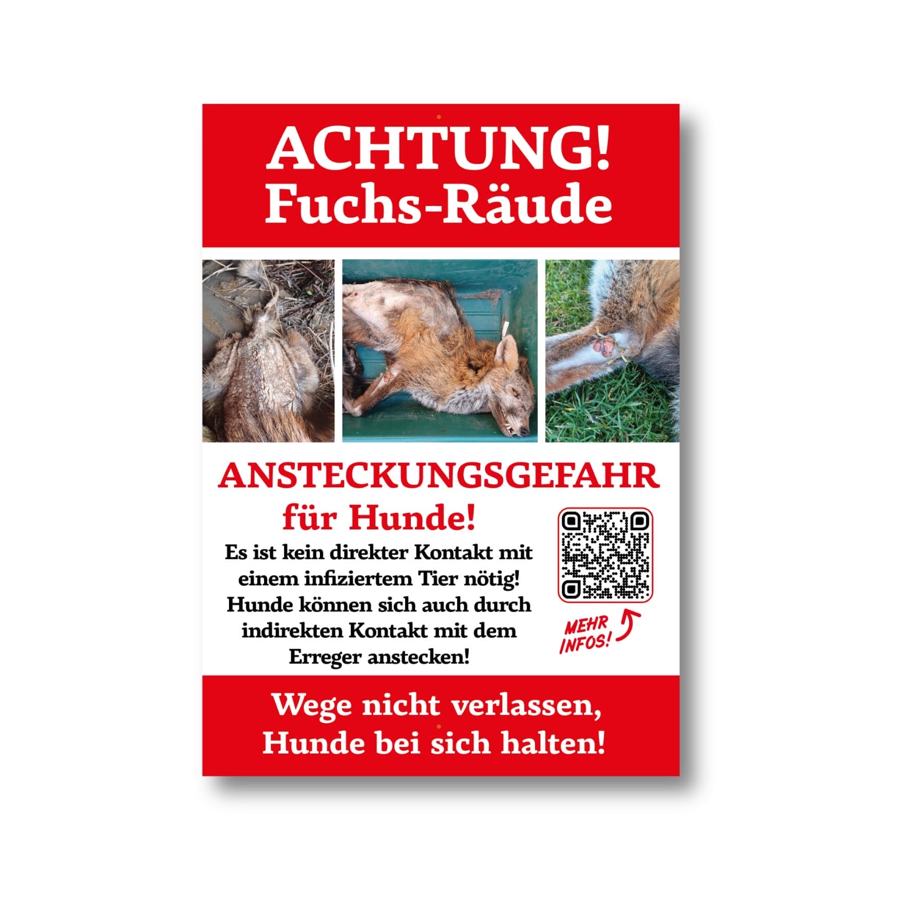 Zusätzlich ist ein QR-Code integriert, der direkt zu unserem Blog führt, wo die Problematik der Fuchsräude ausführlich erklärt wird – so erhalten Passanten verlässliche und leicht verständliche Informationen.